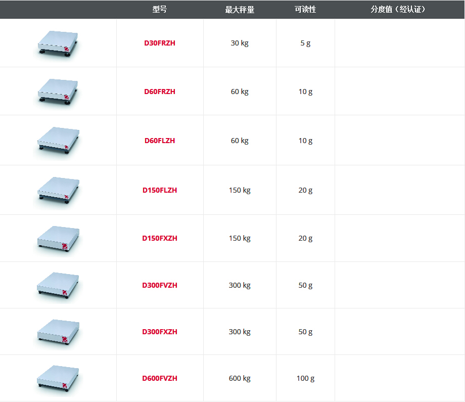 5種稱量范圍(30 kg, 60 kg, 150 kg, 300 kg, 600 kg),4種工業(yè)標(biāo)準(zhǔn)秤盤尺寸(300 × 350 mm, 400 × 500 mm, 500 × 600 mm and 600 × 800 mm). |